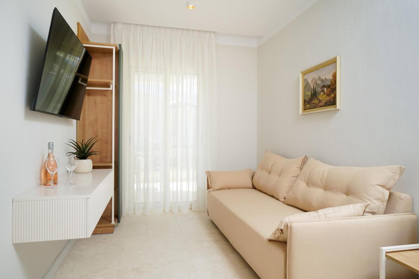 Suite with Sea View. Boasting a private entrance, this air-conditioned suite features 1 living room, 1 separate bedroom and 1 bathroom with a bath and a shower. Guests can make meals in the kitchenette that has a stovetop, a refrigerator, kitchenware and a toaster. Featuring a balcony with sea views, this suite also features a coffee machine and a flat-screen TV with streaming services. The unit has 2 beds. ;