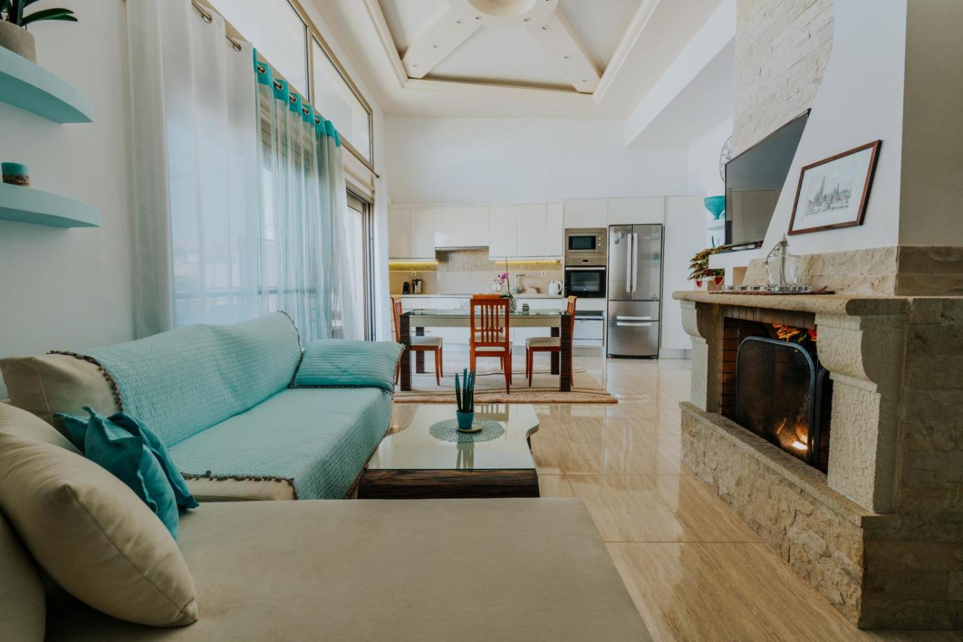 Two-Bedroom Apartment. This apartment offers a fireplace. This spacious apartment comprises 1 living room, 2 separate bedrooms and 1 bathroom with a bath and a hairdryer. Meals can be prepared in the well-fitted kitchen, which comes with a stovetop, a refrigerator, kitchenware and an oven. The air-conditioned apartment provides a flat-screen TV, a washing machine, a coffee machine, a seating area as well as sea views. The unit offers 4 beds.
