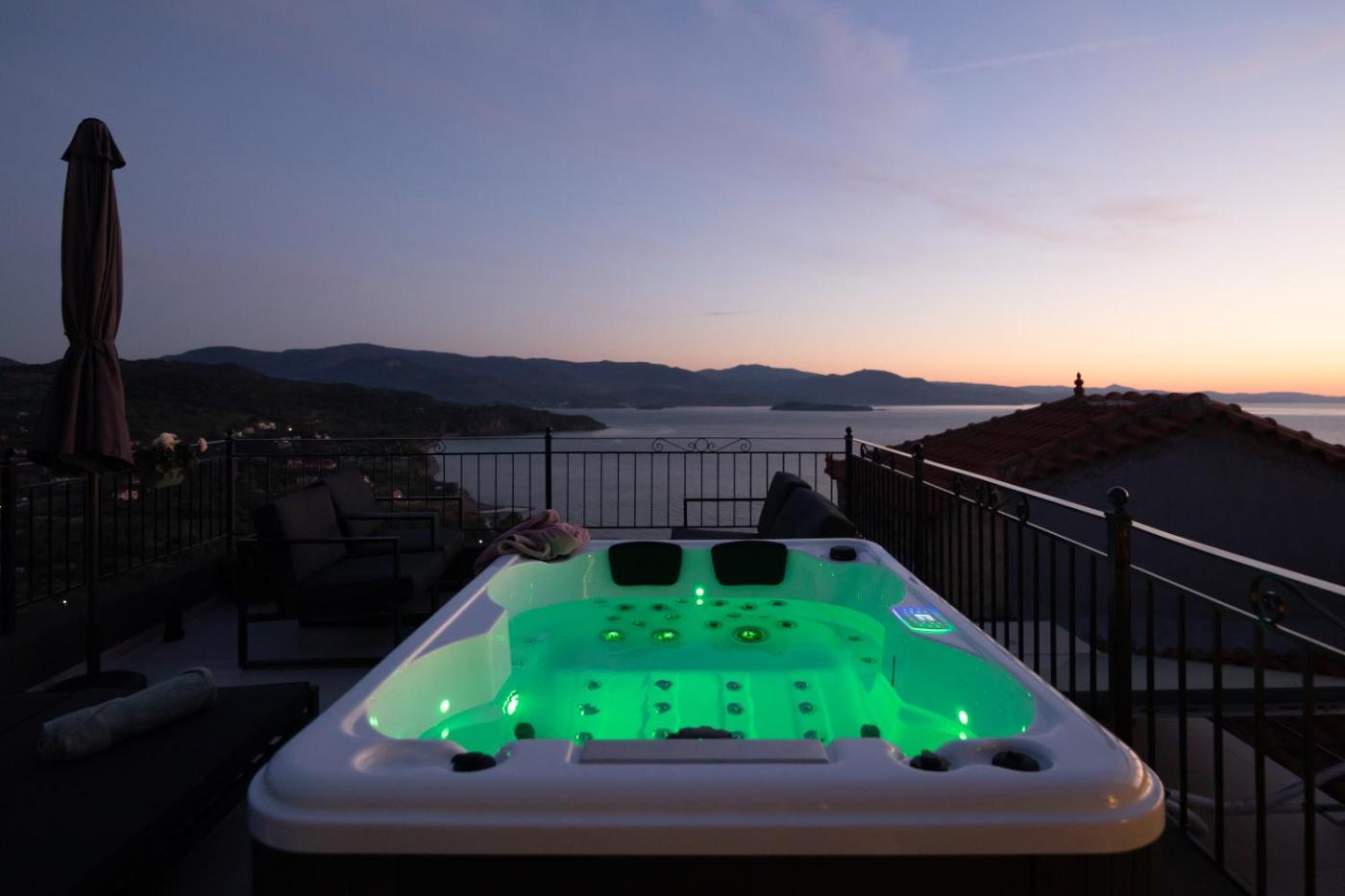 Two-Bedroom Villa. This villas standout features are the hot tub and fireplace. Boasting a private entrance, this air-conditioned villa includes 1 living room, 2 separate bedrooms and 3 bathrooms with a shower and a hairdryer. In the kitchen, guests will find a stovetop, a refrigerator, a dishwasher and kitchenware. Featuring a terrace with sea views, this villa also offers a washing machine and a flat-screen TV with streaming services. The unit has 3 beds.