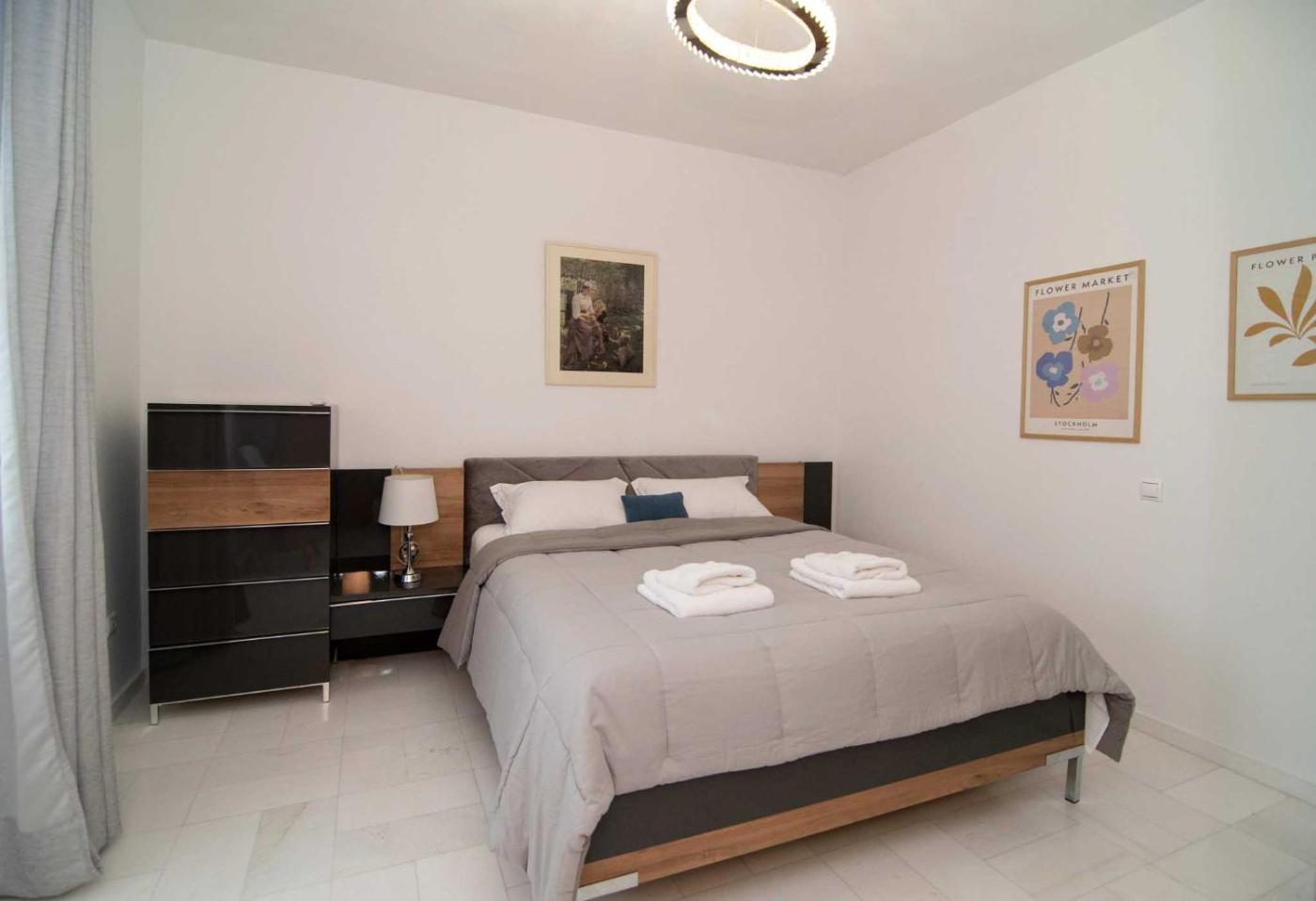 Two-Bedroom Apartment. Boasting a private entrance, this air-conditioned apartment features 1 living room, 2 separate bedrooms and 2 bathrooms with a bath and a shower. The well-fitted kitchen has a stovetop, a refrigerator, an oven and a toaster. The spacious apartment features a flat-screen TV, a washing machine, soundproof walls, a tea and coffee maker as well as sea views. The unit has 3 beds.